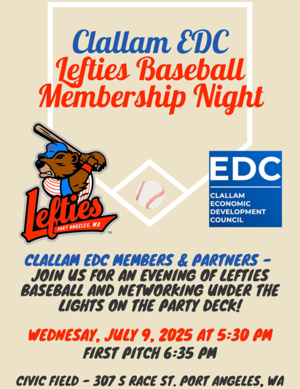 Clallam County EDC Members and Partners — mark your calendars for Lefties Baseball EDC Membership Night on Wednesday, July 9th at 5:30 PM at Civic Field. Join us on the party deck for an evening of baseball, networking, and summer fun under the lights. Food and beverages will be available for purchase at the ballpark. We look forward to seeing you there! Please register below.