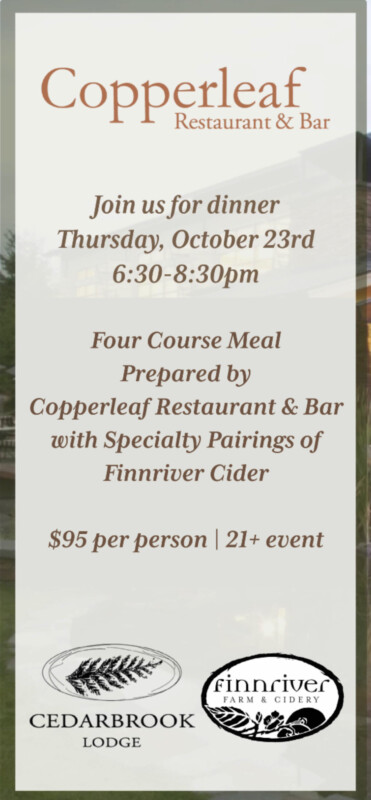 Join us for a night of culinary creations & specialty ciders in collaboration with the Copperleaf Restaurant & Bar at the Cedarbrook Lodge
