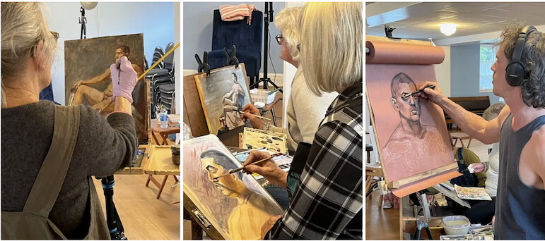 Bring your own art materials (charcoal, watercolors paper, etc.). We have easels, tables and "horses" (drawing benches with an upright support for a drawing pad.) In the afternoon, media used range from graphite, charcoal and pastel to watercolor, gouache and oil paint. Those working in oil generally bring their own easel for ease of setup.