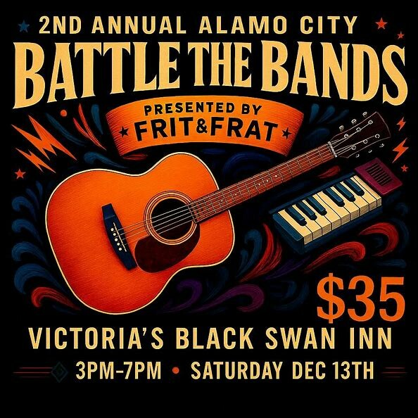 Searching for a festive day filled with incredible music before Christmas? Frit and Frat proudly present their highly anticipated "2nd Annual Alamo City Battle of the Bands!" Join us at Victoria's Black Swan Inn as fantastic bands battle it out for the coveted title of Best Band. Immerse yourself in a diverse range of genres, from Classic/Alternative Rock, Country, R&B, and Latin, as Alamo City's top bands showcase their talent. Mark your calendars for Saturday, December 13th, from 3pm - 7pm.