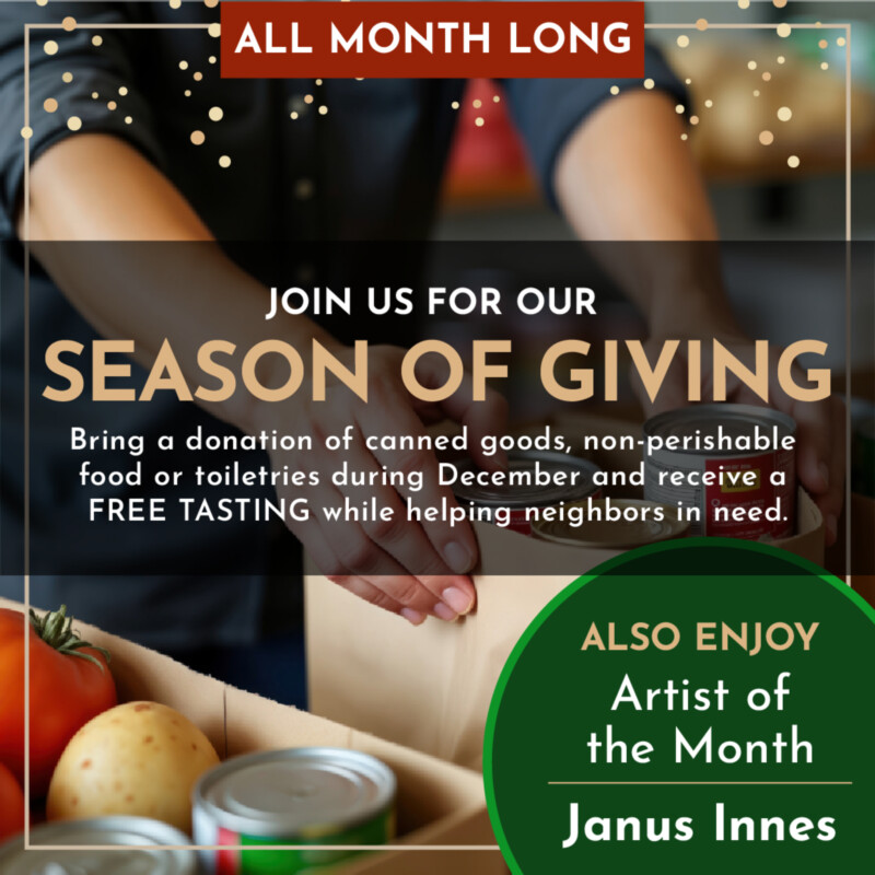 Join us in the Season of Giving! Bring your canned goods, non-perishable food items, and toiletries when visiting our tasting room throughout the month of December. If you're not already a member we're offering a FREE tasting with the donation of any item. Enjoy our artist of the month as well.