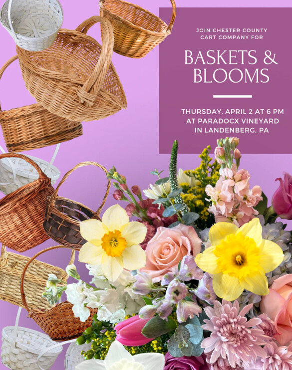 Welcome Spring with us at our Baskets & Blooms floral design workshop! Join us for a fun girls night out, sip a glass of Paradocx wine and enjoy some quality time with friends while creating your own beautiful, custom floral arrangement to take home!