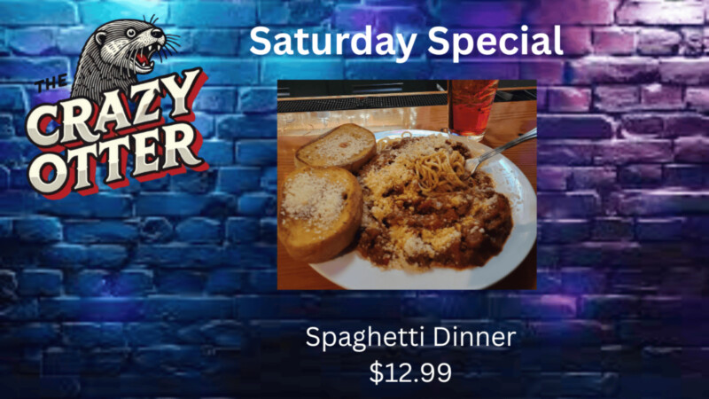 Tonight is Spaghetti Night here at The Crazy Otter. Come get a heaping mound of perfectly cooked pasta with homemade meat sauce and Texas Toast Garlic Bread. You won't leave hungry!
