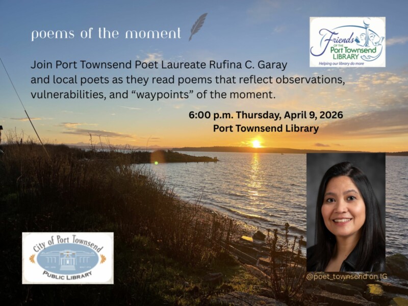 Join the City of Port Townsend Poet Laureate, Rufina C. Garay and local poets as they read poems that reflect observations, vulnerabilities, and “waypoints” of the moment. Free, all ages, bring good questions. Come see the stack of the “Poet Laureate’s Picks” at the library and share some snacks.