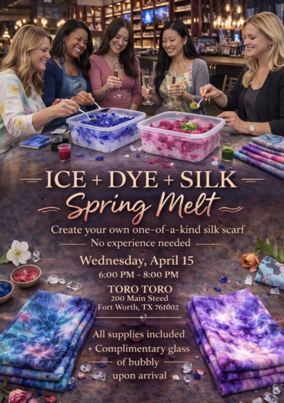 Let Spring Melt and kick off your art spirit for the Main Street Art Festival! Grab your friends or meet new friends at this unique art & fashion class as Melanie Summers (as seen on 360 WEST Magazine) teaches us how to create your own scarf using Ice + Dye + 100% Silk.